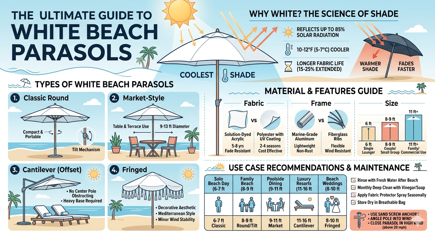 Hvit er ikke bare et stilvalg - det er den mest termisk effektive fargen for en strandparasoll fordi lyse overflater reflekterer i stedet for å absorbere solenergi.